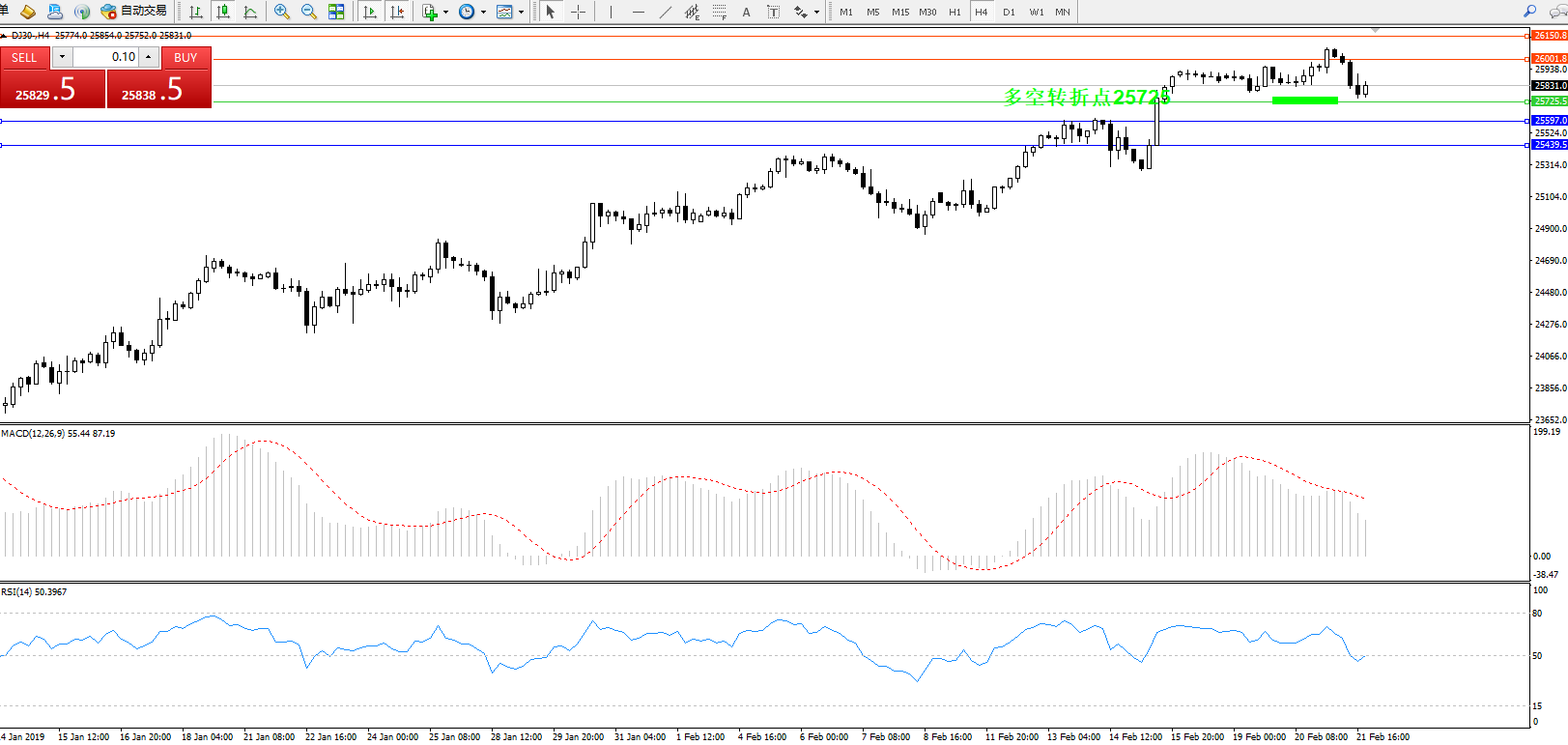 道琼斯指数DJ30—— 4小时K线图显示: