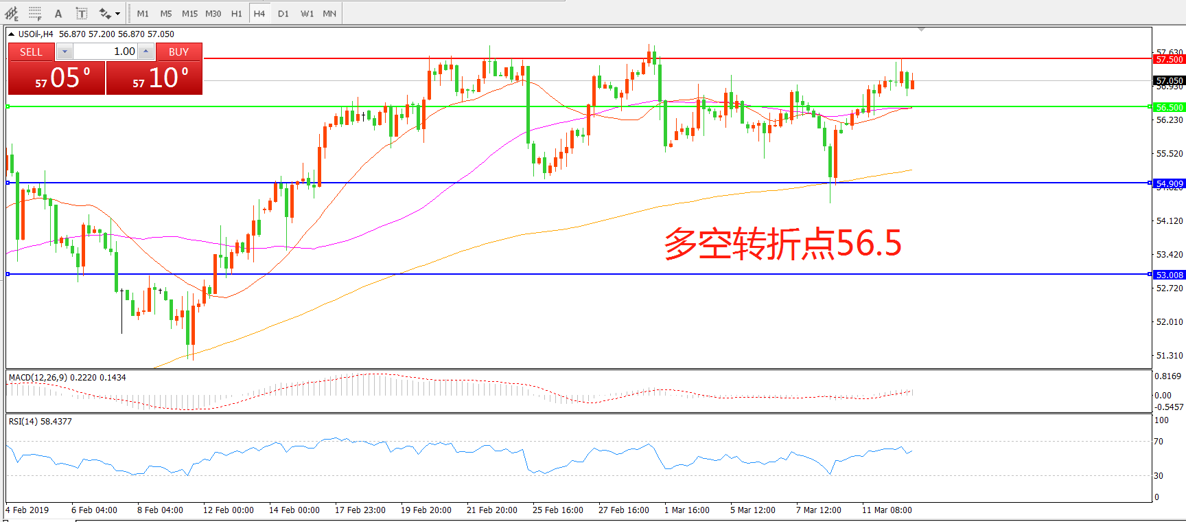 4小时图看,油价触及200周期均线附近连续反弹,触碰57.5阻力后小幅回落,短期走势依然偏强,均线系统粘合形成支撑,MACD红柱增加,日内震荡上行概率较大