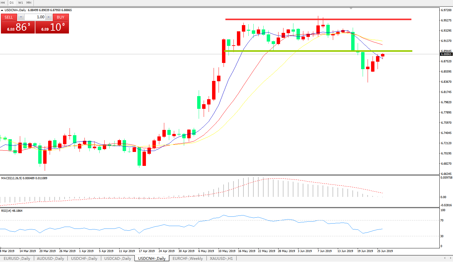 技术面简析:日线图呈有序空头排列,MACD逼近0轴且动能柱绿柱开始显现,RSI开始反弹走高,贸易争端缓解预期犹在,G20临近,预计汇价大概率将进一步走低。