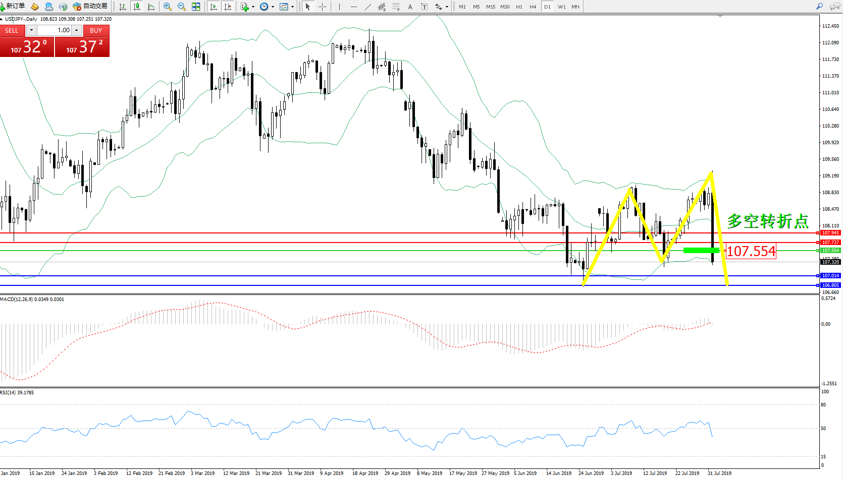 交易策略:107.554下方看跌,目标107.014106.805