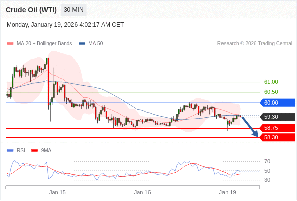 交易策略: 在 60.00 之下,看跌,目标价位为 58.75 ,然后为 58.30 。