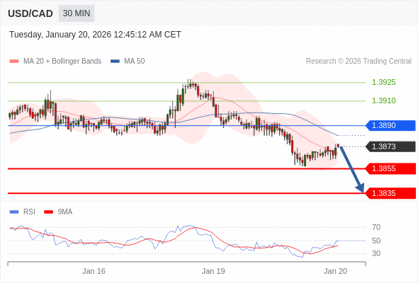 在 1.3890 之下,看跌,目标价位为 1.3855 ,然后为 1.3835 。