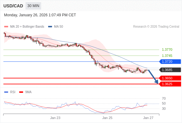 在 1.3720 之下,看跌,目标价位为 1.3650 ,然后为 1.3625 。
