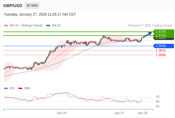 在 1.3640 之上,看涨,目标价位为 1.3710 ,然后为 1.3735 。