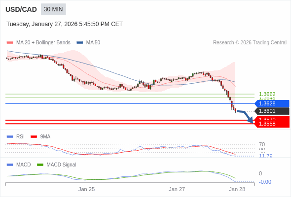 技术点评: RSI技术指标小于30。在这种情况下,说明有很强的下跌趋势,或者意味着处在超卖的状态下,可能会有向上的反弹。我们将观察RSI技术指标是否出现背离现象。 MACD技术指标处在其信号线之下看空。 配置为负。 此外,价位低于其20天及50天移动平均线 ( 分别位于1.3688 和1.3704 )。