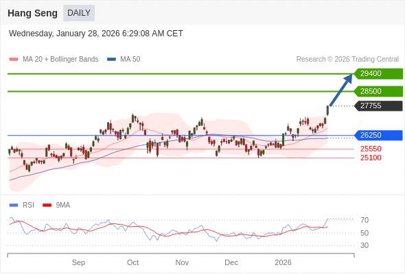 恒生指数 短线: 上升趋势。