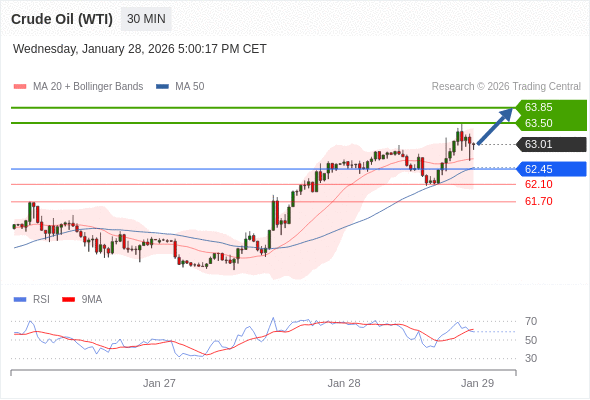 在 62.45 之上,看涨,目标价位为 63.50 ,然后为 63.85 。