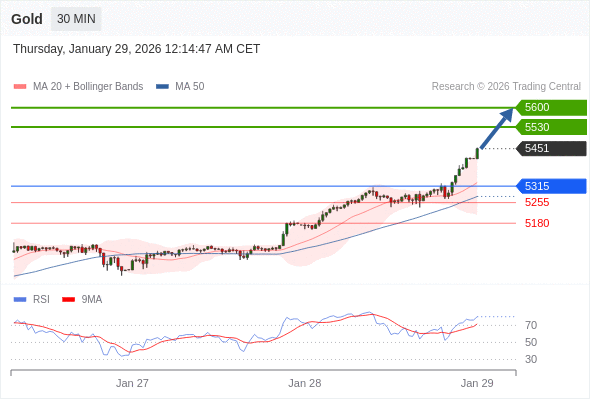 黄金现货 当日内: 目标位为5600。