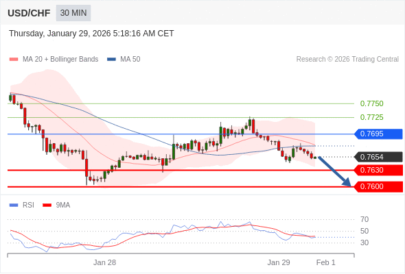 在 0.7695 之下,看跌,目标价位为 0.7630 ,然后为 0.7600 。