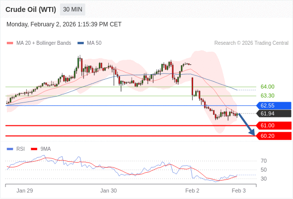 在 62.55 之下,看跌,目标价位为 61.00 ,然后为 60.20 。