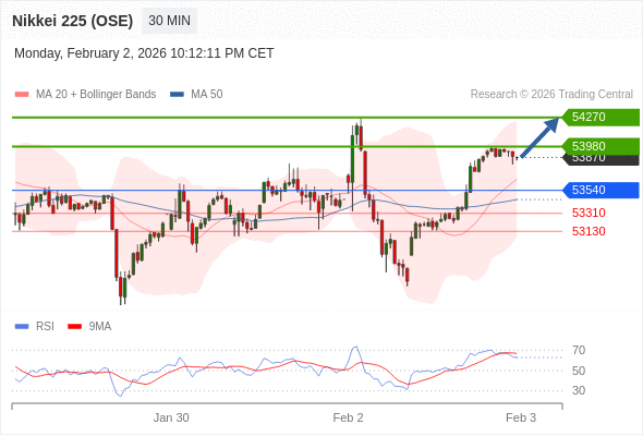 日经225股指期货 (OSE) 当日内: 在53540之上,看涨。