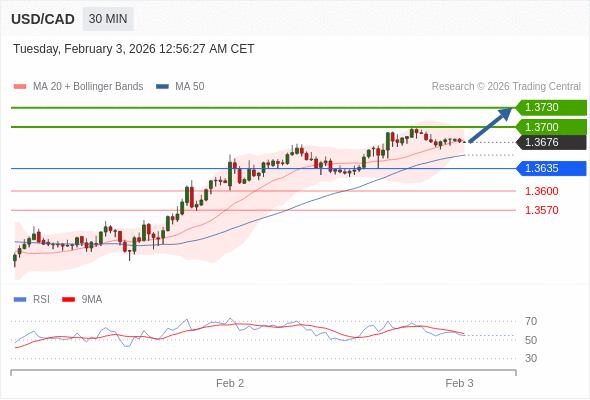 在 1.3635 之上,看涨,目标价位为 1.3700 ,然后为 1.3730 。