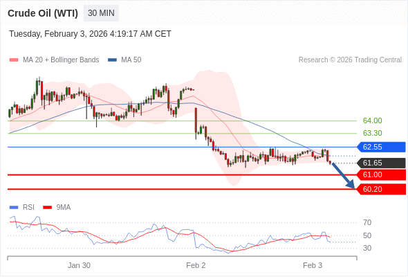 在 62.55 之下,看跌,目标价位为 61.00 ,然后为 60.20 。