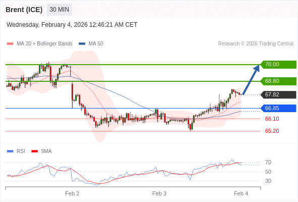 在 66.85 之上,看涨,目标价位为 68.80 ,然后为 70.00 。