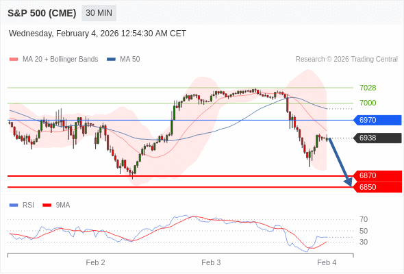 美国标普500指数期货 (H6) 当日内: 短期关键阻力位在6970。