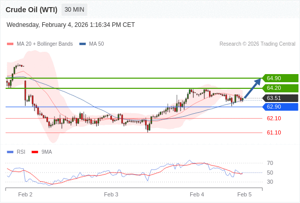 在 62.90 之上,看涨,目标价位为 64.20 ,然后为 64.90 。