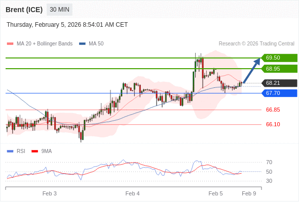 布伦特原油 (ICE) (J6) 当日内: 在67.70之上,看涨。