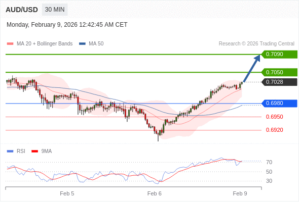 在 0.6980 之上,看涨,目标价位为 0.7050 ,然后为 0.7090 。