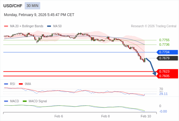 美元/瑞郎 当日内 : 看跌,在 0.7704 之下。