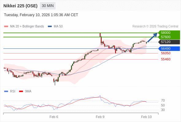 在 56490 之上,看涨,目标价位为 57600 ,然后为 58000 。