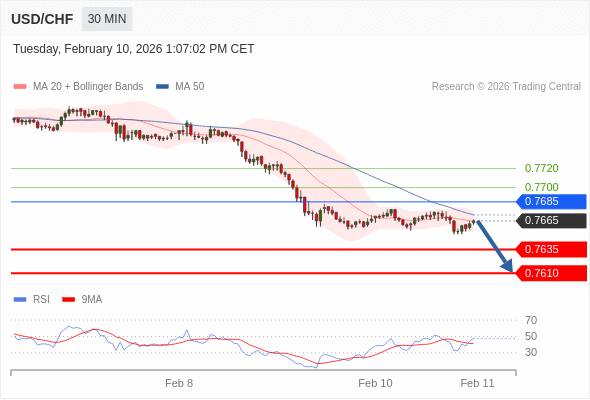 在 0.7685 之下,看跌,目标价位为 0.7635 ,然后为 0.7610 。