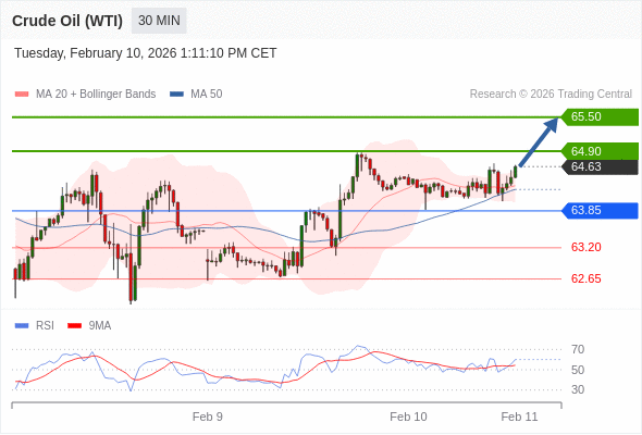在 63.85 之上,看涨,目标价位为 64.90 ,然后为 65.50 。