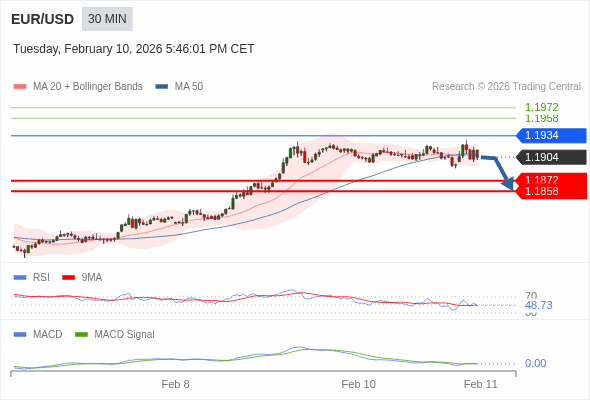 欧元/美元 当日内 : 看跌,当 1.1934 为阻力位。
