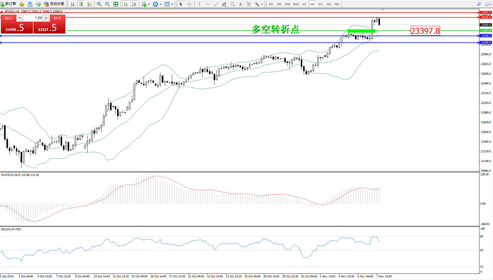 日经225指数11月7日(周四)收盘下跌2.32点,跌幅0.01%,报23301.50点。 日美两国国债走势几乎同步;关联度上升,经济不再进一步恶化的情况下日美两国央行看上去都倾向于维持利率不变,在这种背景下,两国基准国债的关联度上升到了一年多以来的最高水平。自9月底以来,10年期日本国债和美国国债收益率上涨的基点数几乎是一模一样。日本央行行长黑田东彦对于经济的相对乐观态度表明,接下来最有可能出现的情境是继续维持现有利率水平,日本央行势在进一步放松政策的市场预期已经因此而降温 。