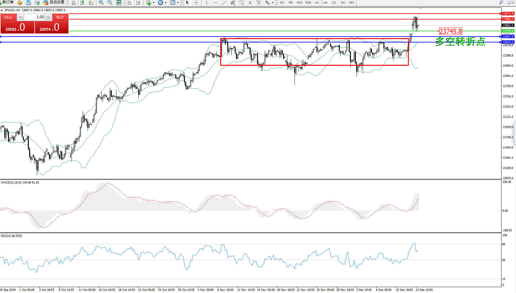 日经225指数1213日(周五)收盘上涨609.19点,涨幅2.60%,报24034.00点。美国总统特朗普发表的关税方面言论,提振了市场乐观情绪,日本首相安倍晋三:将热烈欢迎英国加入TPP贸易协议,希望继续推进16个国家参与的区域全面经济伙伴关系协定(RCEP),内阁将会在今日通过额外预算案,本人的“政治遗产”将是恢复经济,我还有2年的任期,目前还没有结束,希望成为成功修宪的首相,目前来说,提高消费税的效果比上一次小。会密切关注提高消费税的效果。希望英国决定其方向,使前景更加清晰。