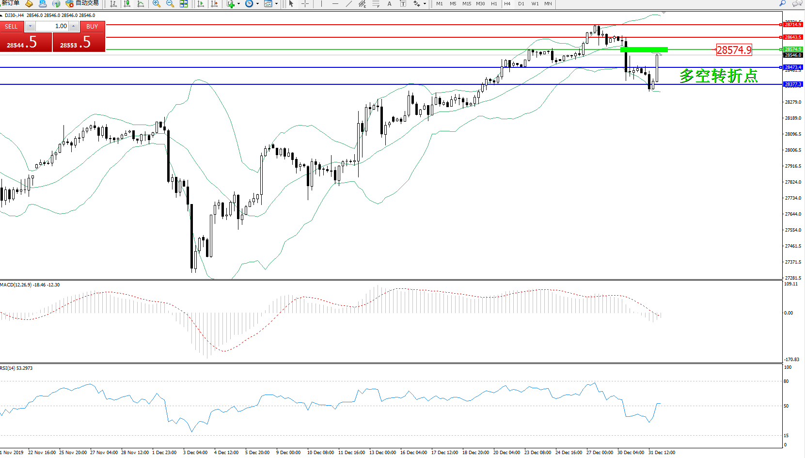 道琼斯指数DJ30—— 4小时K线图显示: