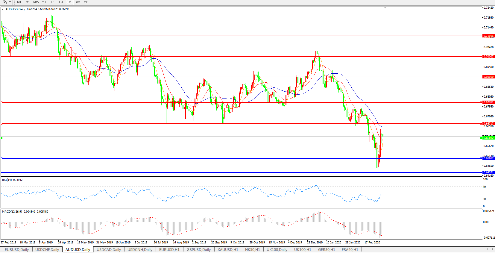 技术面简析:日图均线呈空头排列但短期均线拐头迹象明显,汇价持续走升徘徊在0.66关口附近,MACD于0轴下方逐步止跌且量能收缩,RSI小幅回升,预计汇价大概率将止跌回升上行。