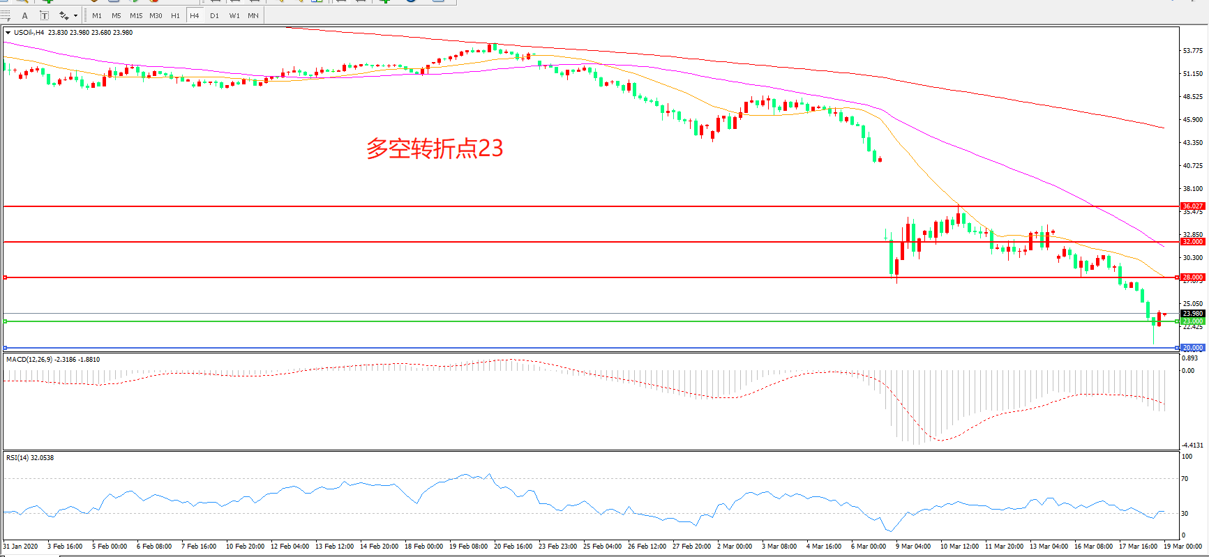 交易策略:在23.00之下看跌,目标20.00 18.00