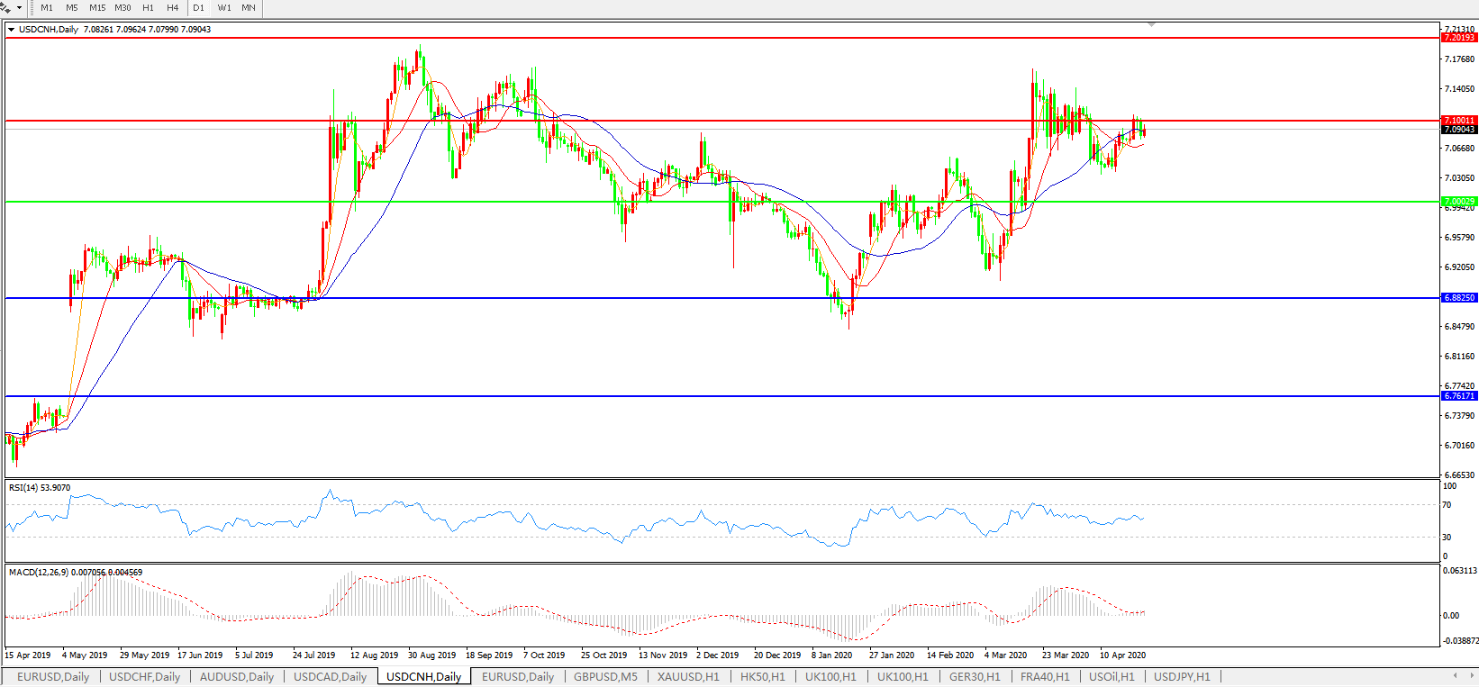 技术面简析:日图均线有粘合整理迹象,汇价7.10关口下方窄幅整理,MACD延续下行态势但量能小幅放量,RSI震荡中走缓,预计短期汇价将在整理后进一步上行,关注7.10关口的争夺。