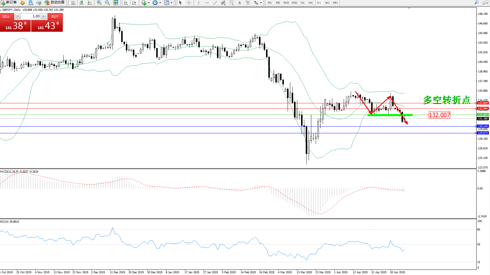交易策略:132.007下方看跌,目标130.144、129.074