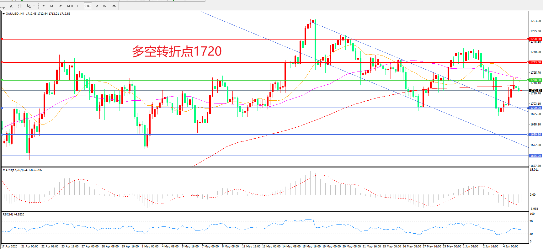 4小时图看,金价延续宽幅震荡形态,1720成为短期阻力,1700关口成为下方支撑,短期均线逐步下行, MACD绿柱减少,RSI指标走平,日内延续震荡概率较大。
