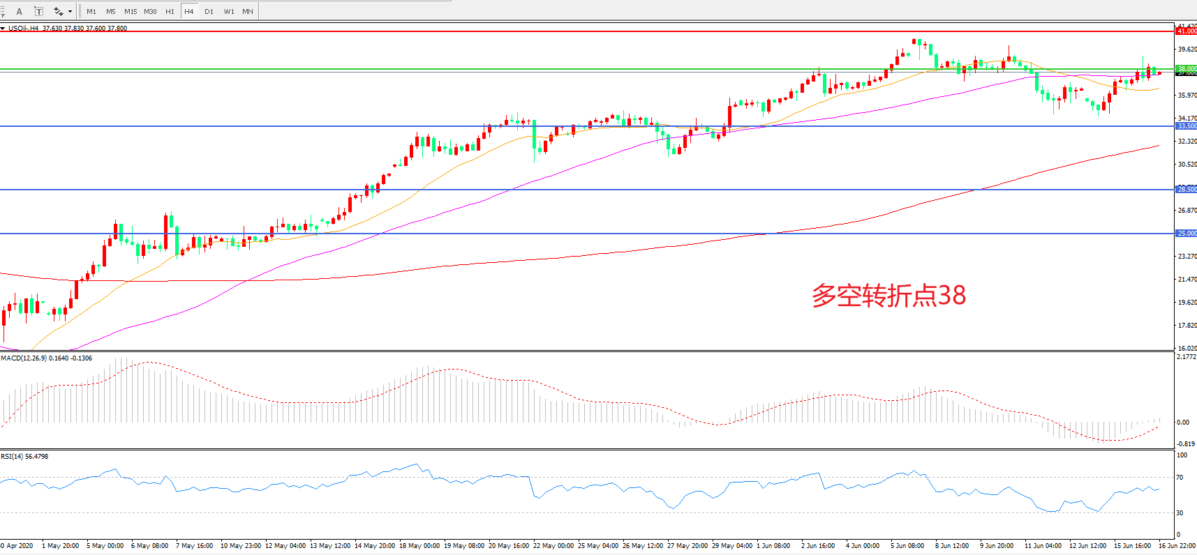 周三(6月17日)凌晨,美国石油协会(API)公布的数据显示,当周API原油库存增加385.7万桶,远超预期,汽油精炼油同步增加,美国WTI原油快速走低后震荡回升,截止发稿前收报37.56美元/桶。如果今晚的EIA数据也是相对利空,那么原油价格仍将会面临一定的调整压力,务必重点关注。