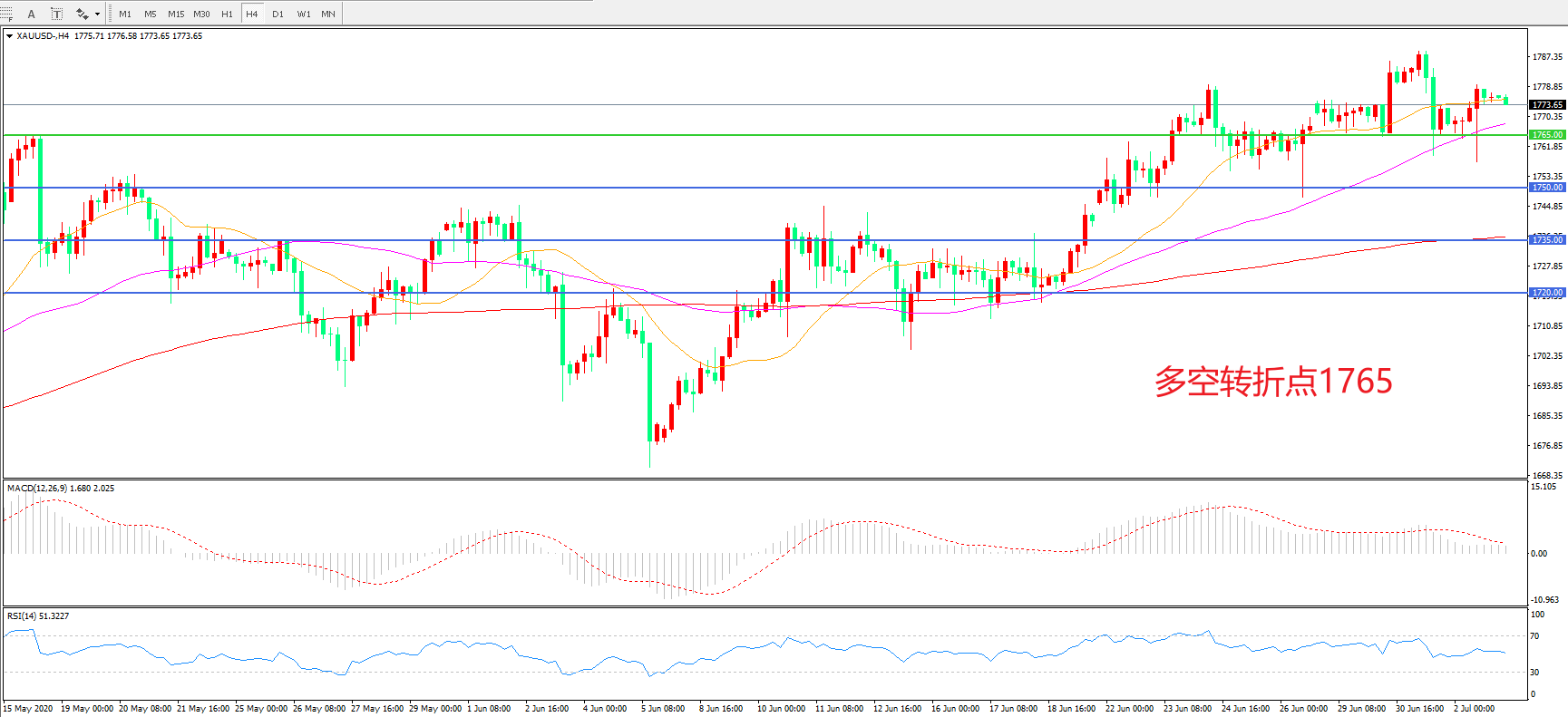 交易策略:在1765.00之上看涨,目标1780.00   1800.00