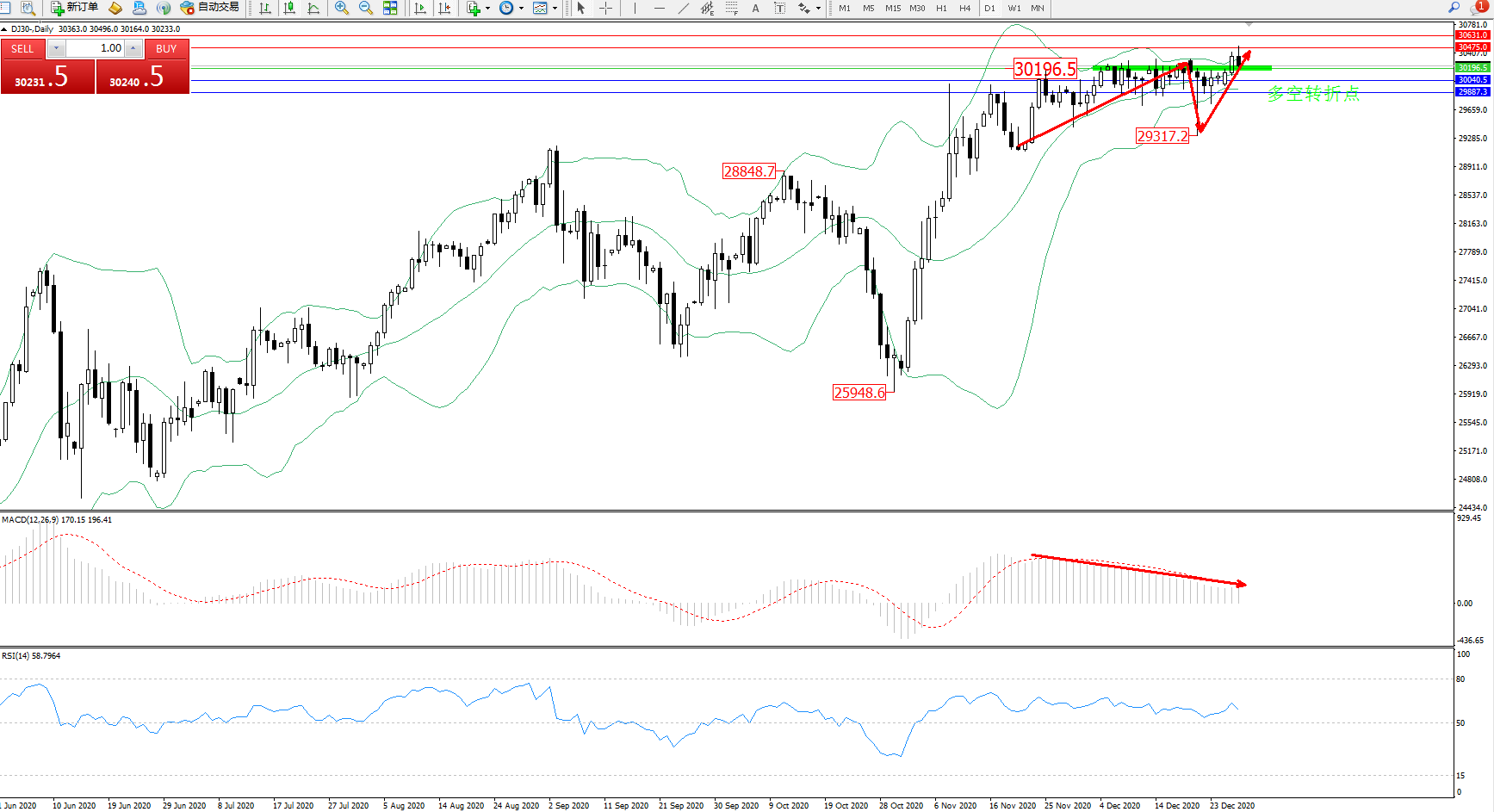 交易策略:30196上方看涨,目标30475、30631