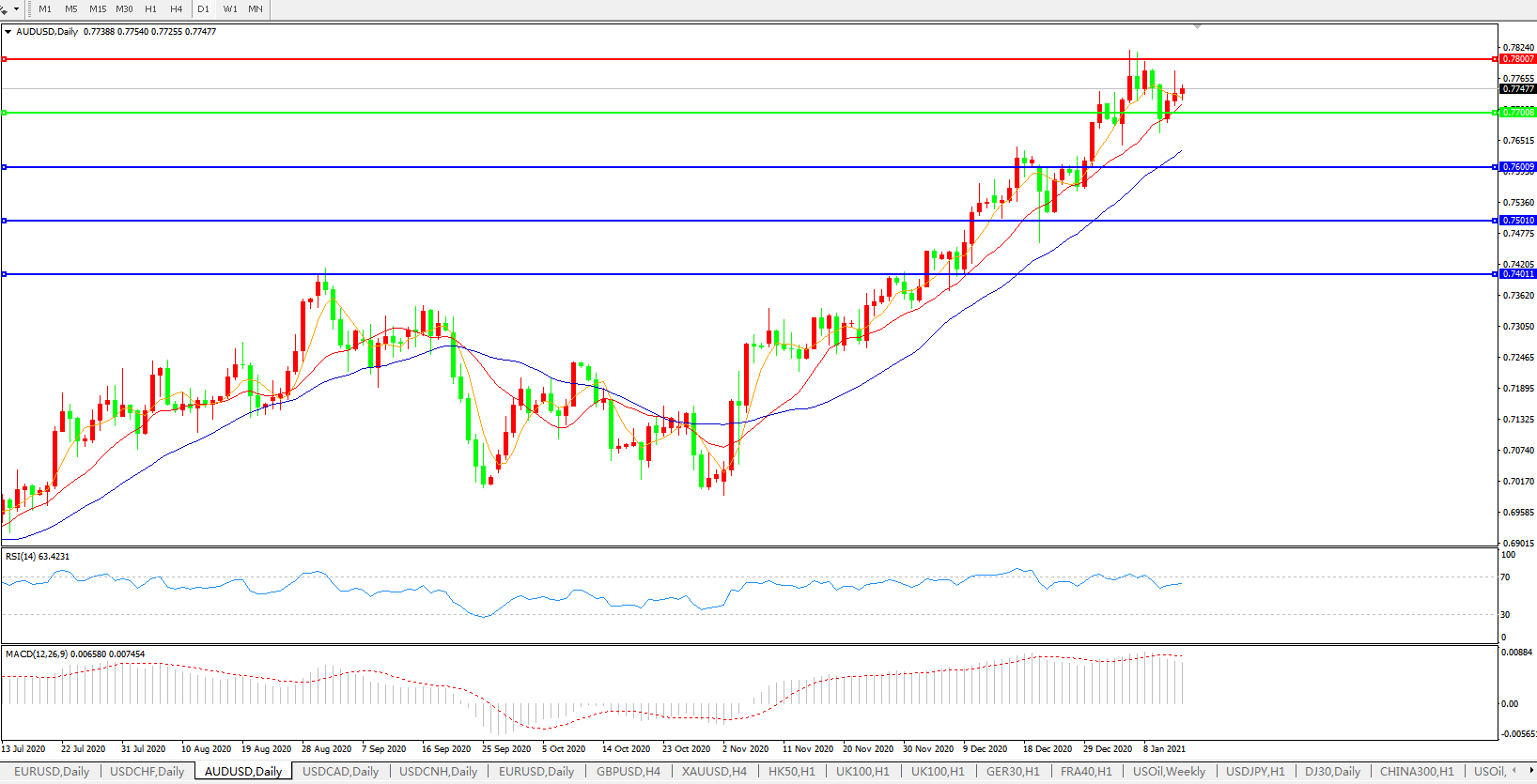 交易策略:0.7700上方看涨,目标0.7800、0.7900
