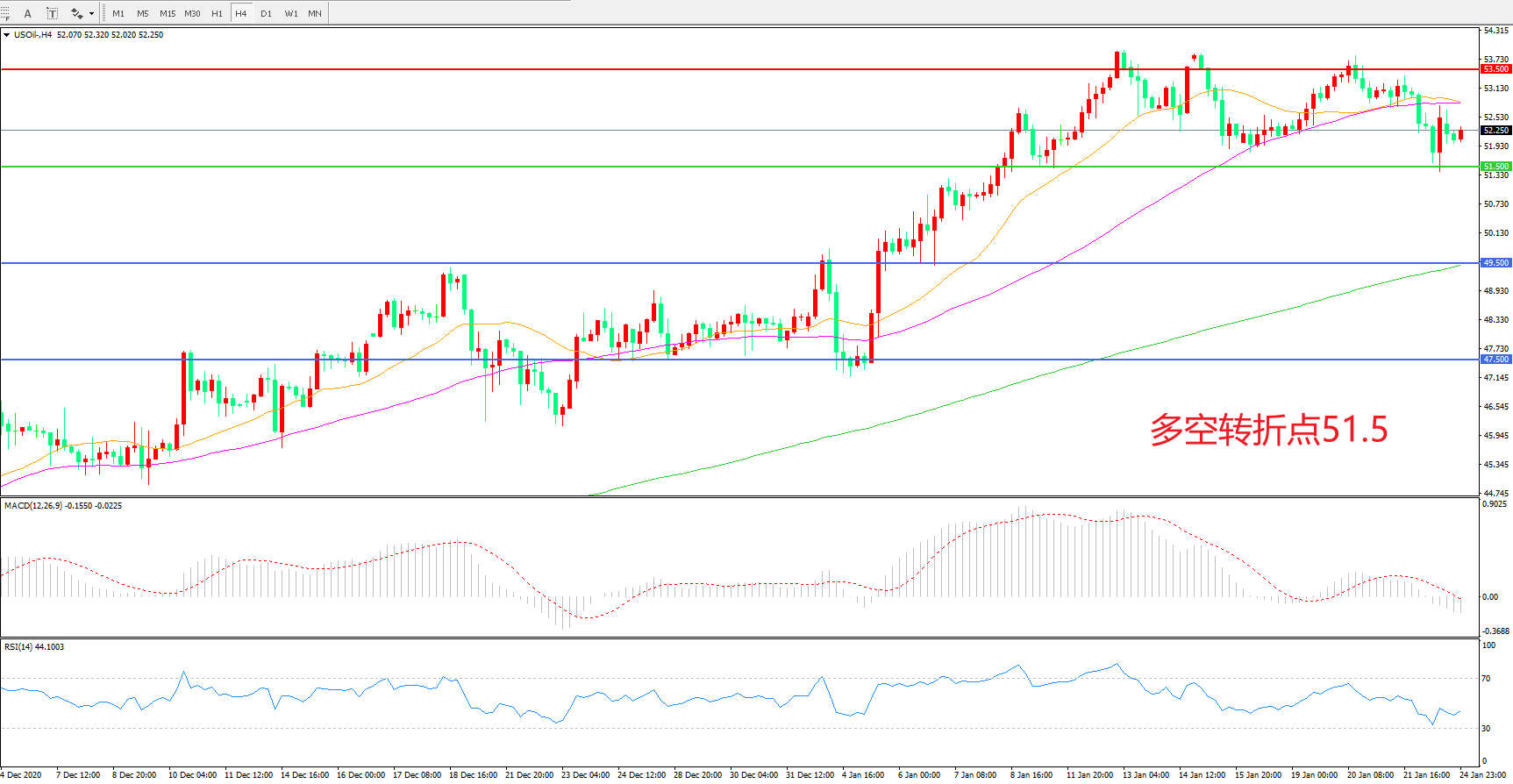 上周,原油走势一波三折,在拜登就任带来的提振下,美国WTI原油在前三个交易日震荡上行,成功站上53美元,但后期上行动能明显不足,最终小幅回落后收报52.06美元/桶,当周EIA数据显示美国原油供应量意外大增,加重了市场对石油需求的担忧。