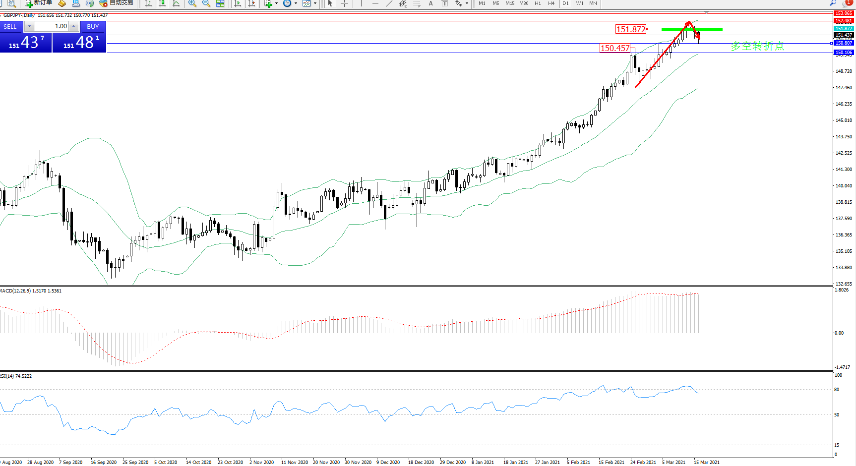 交易策略:151.872下方看跌,目标150.807、150.106