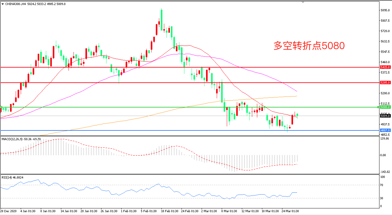 4小时图看,沪深300低位高开高走,短期看有止跌迹象,但整体来看依然处于空头形态之中,5080成为上方阻力,4875成为下方支撑,MACD绿柱缩短,RSI指标走平,日内延续震荡概率较大。