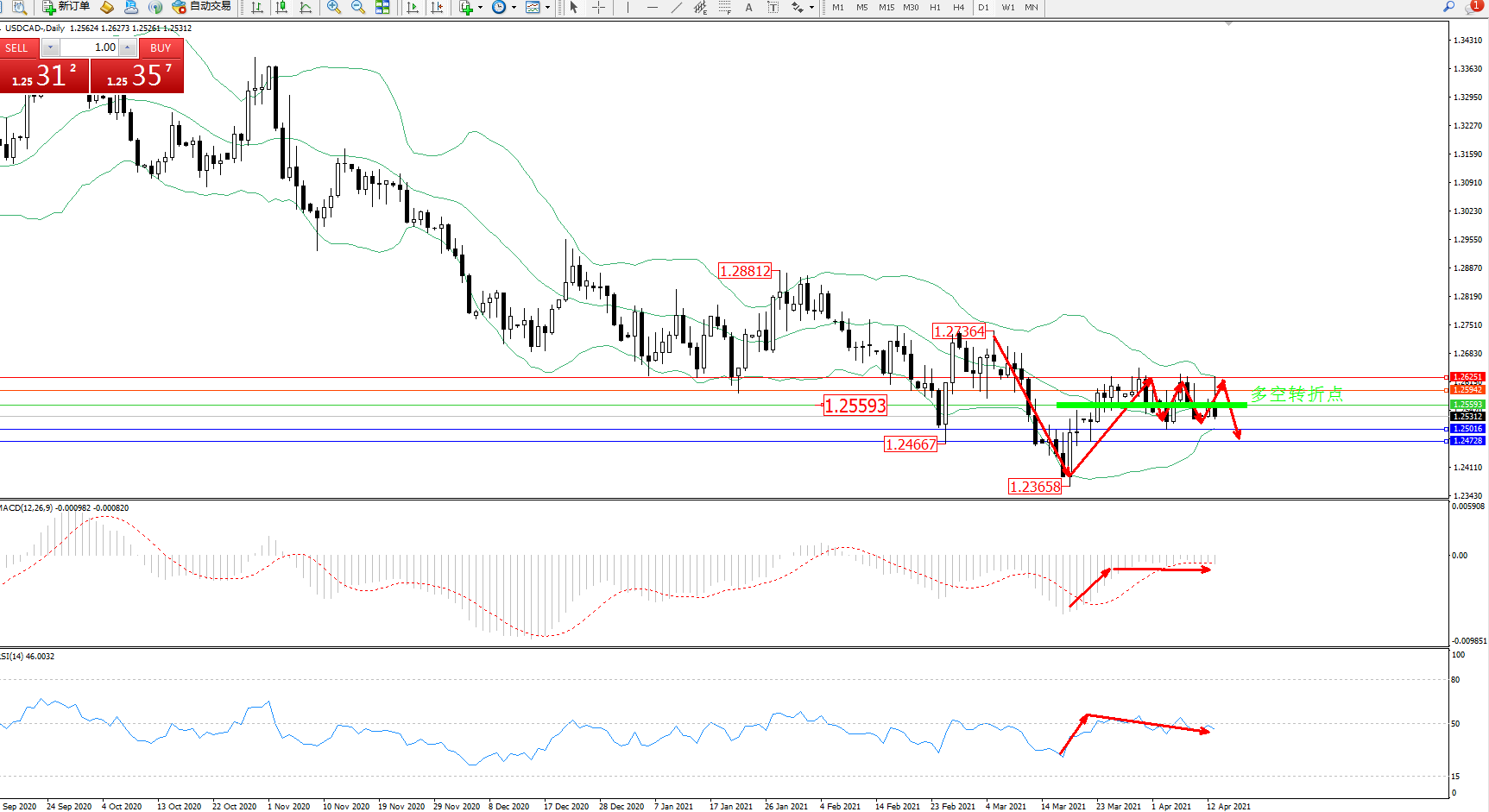 美元加元USDCAD——日K线图显示: