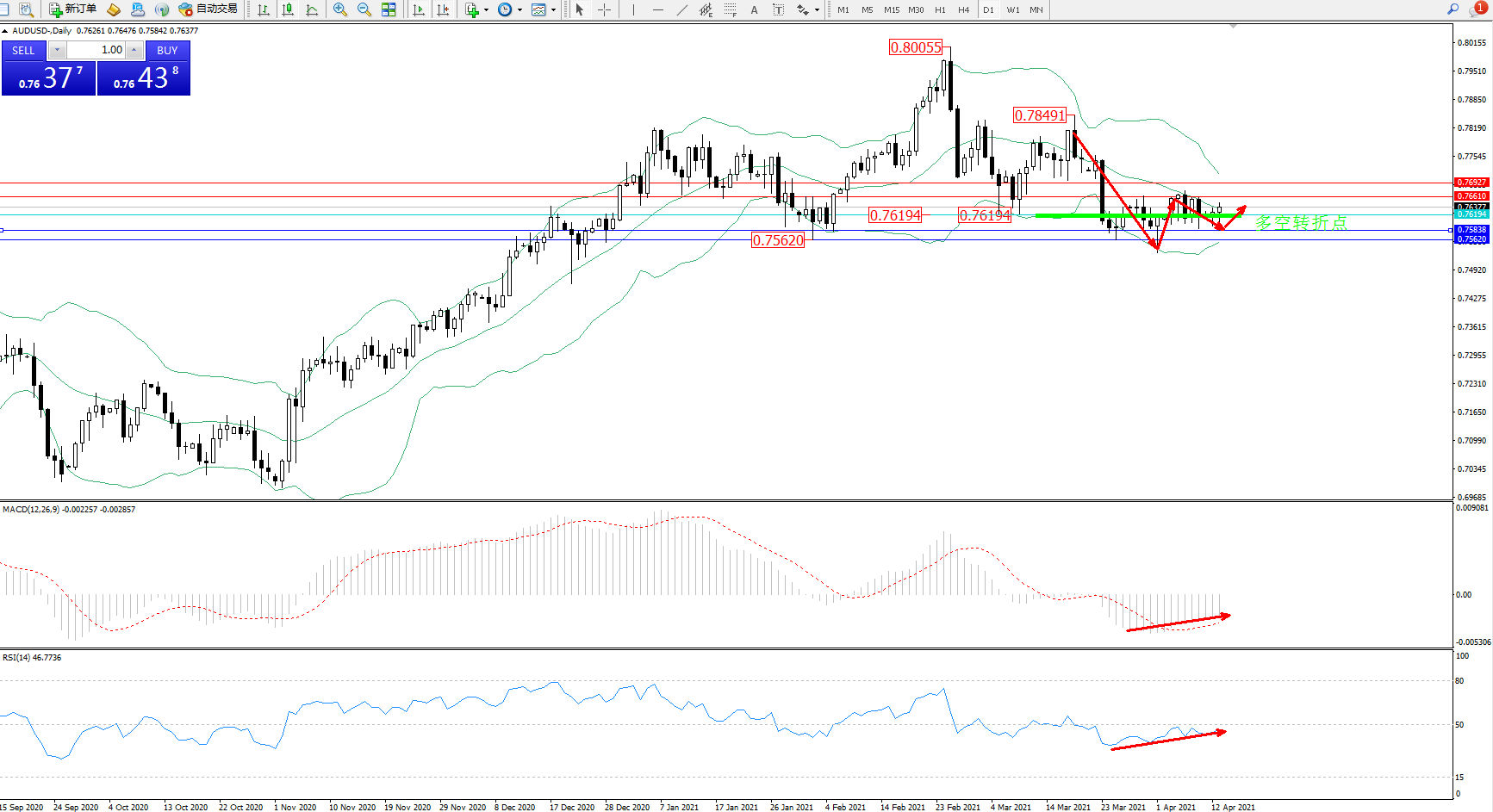 备选策略:0.76194下方看跌,目标0.75838、0.75320
