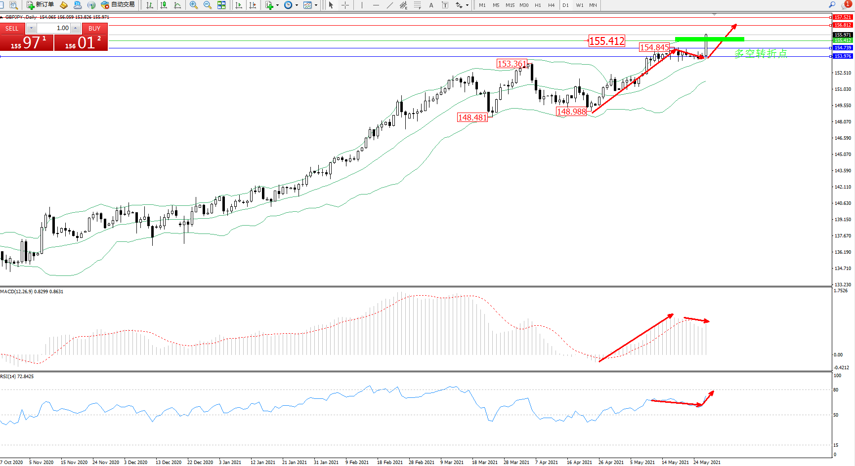 交易策略:155.412上方看涨,目标156.812、157.521