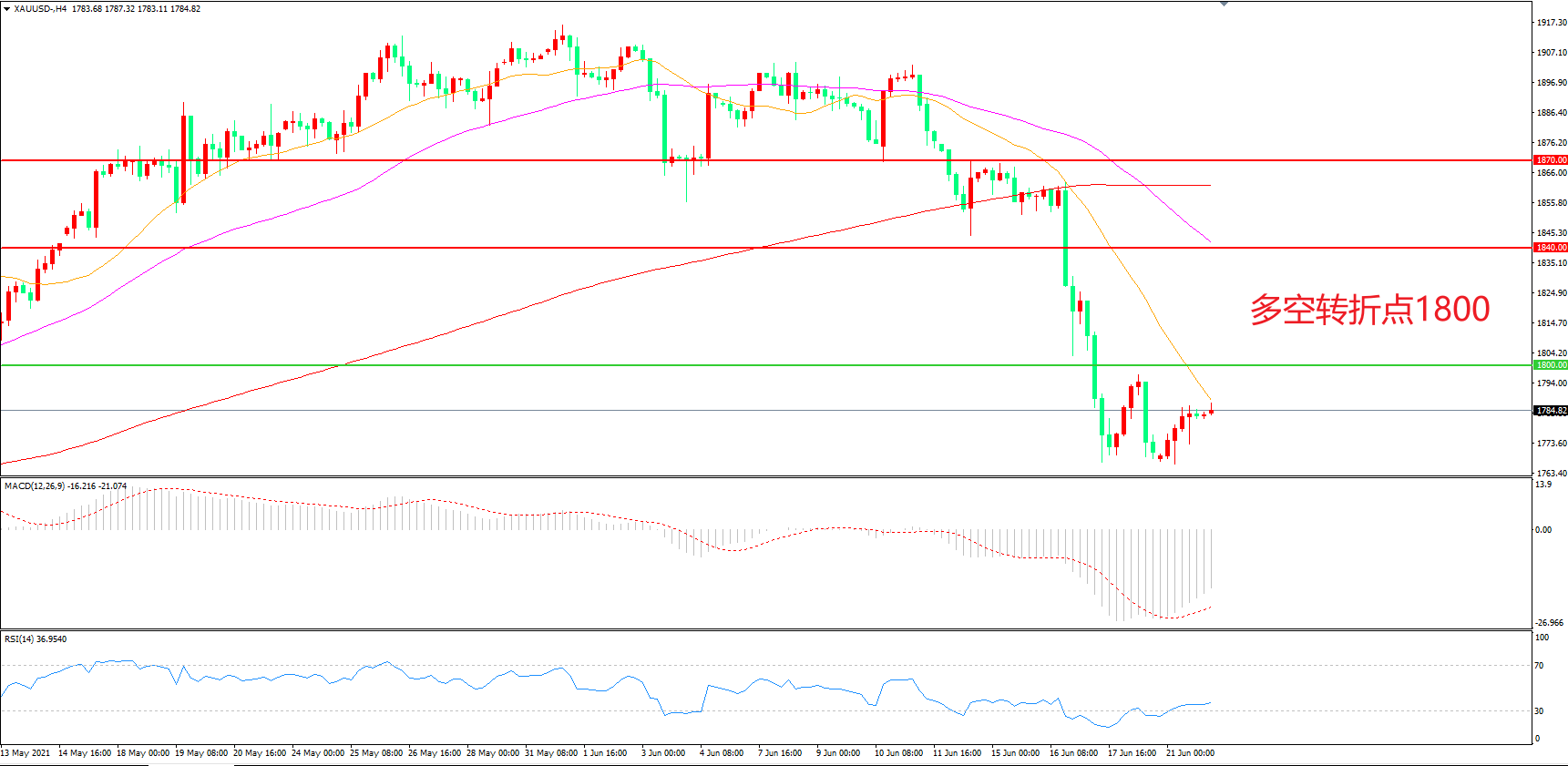 交易策略:在1800.00之下看跌,目标1760.00 1730.00