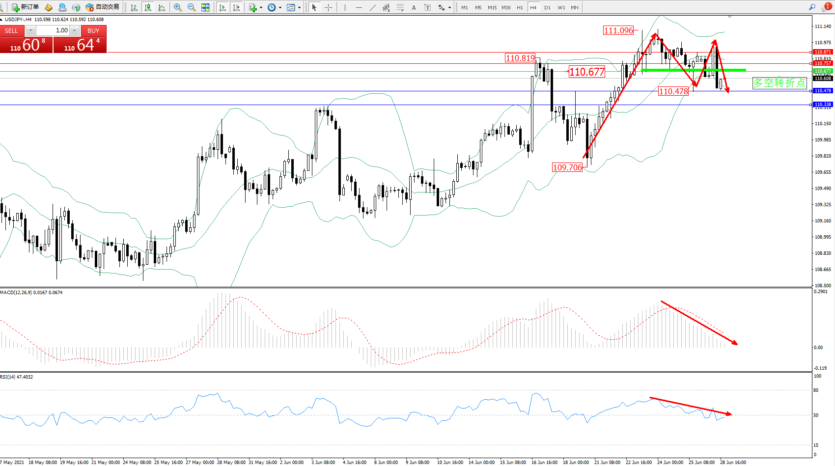 交易策略:110.677下方看跌,目标110.478、110.338
