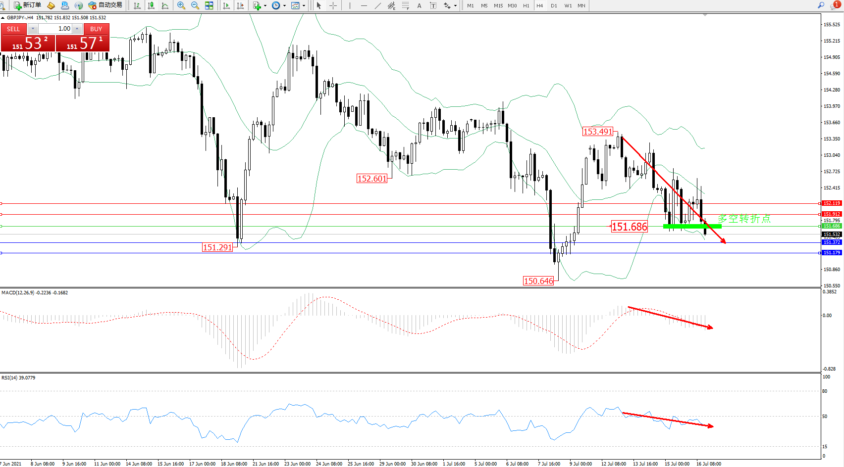交易策略:151.686下方看跌,目标151.372、151.179