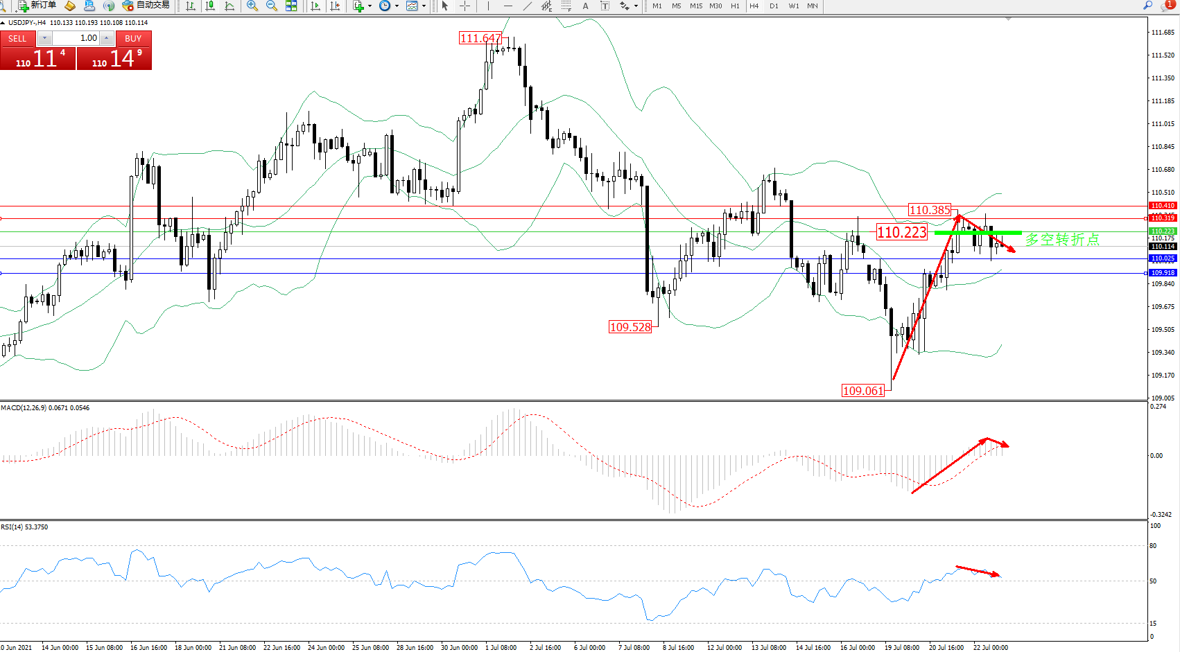 备选策略:110.223上方看涨,目标110.319、110.410