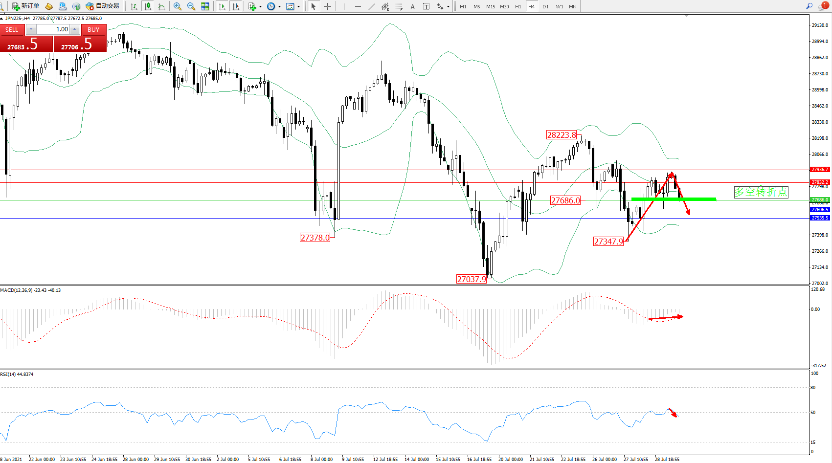 日经指数JPN225——4小时K线图显示: